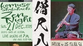 尺八 『虚無僧尺八禅夜』に虚無僧 流水、流禅が出演します。 Komuso Ryusui and Ryuzen will be performing at “Komuso Shakuhachi Zen Night.” 2025年12月21日(日)に阿佐ヶ谷TABASAで開催される『虚無僧尺八禅夜』に虚無僧 流水、流禅が出演します。奥田敦也師の禅茶房門下の虚無僧 流水、流禅、虚禅が、江戸時代に禅の修行として虚無僧が吹いていた尺八の独奏曲である本曲を、虚無僧... 2025.11.30 尺八